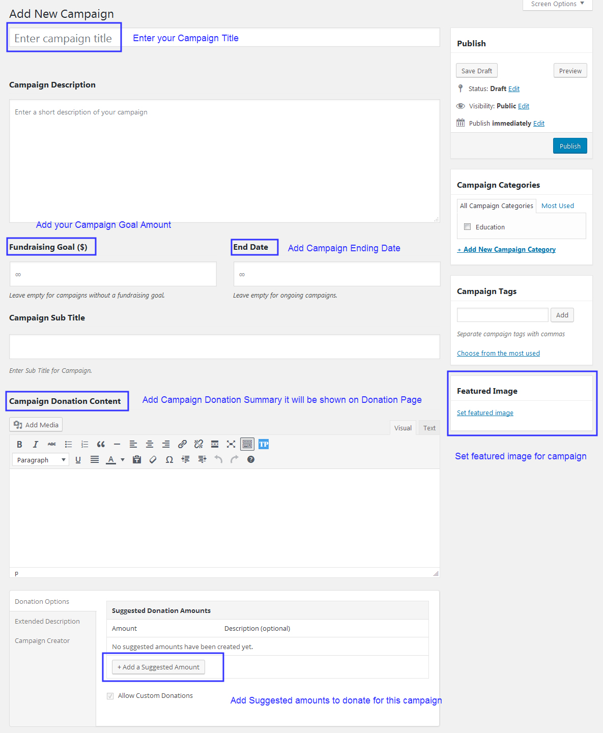 - Enter Campaign Description, Fundraising Goal, Campaign End Date, Campaign Sub Title, Campaign Donation Content it will be shown on this Campaign Donation page, Donation Amount Options and Extended Description of your Campaign.