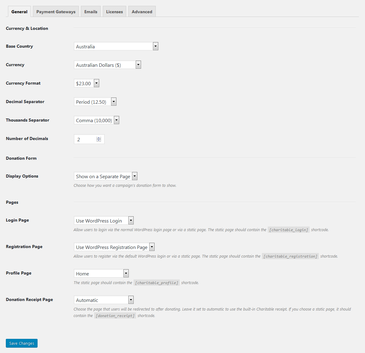 - Here you can change country location, currency code, currency format and can choose separate pages for registration, login, profile and donation receipt page for donators.