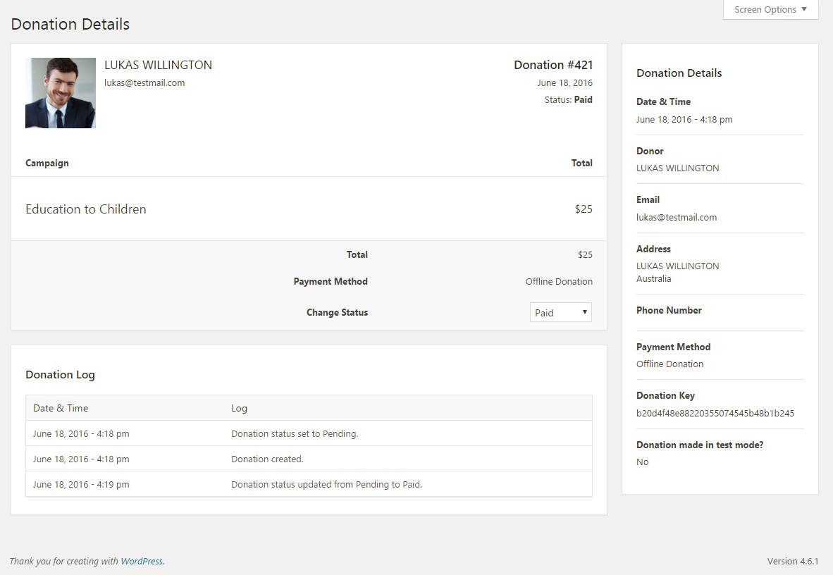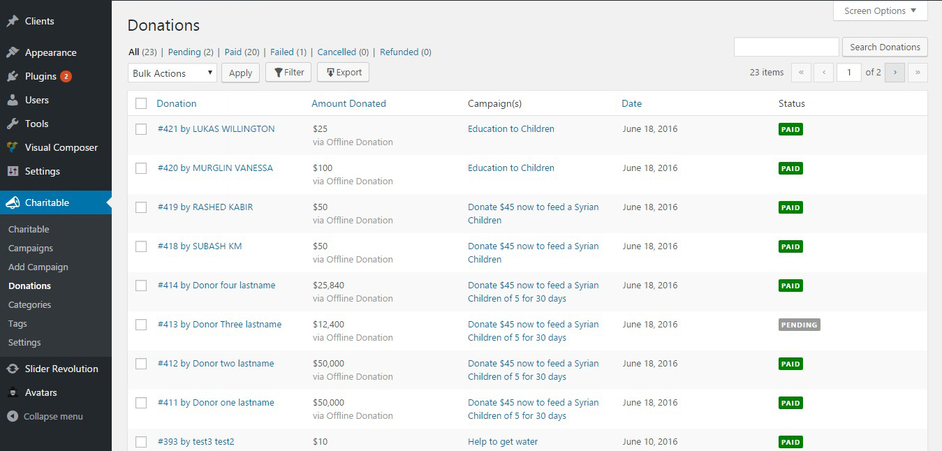 With Charitable plugin, you can easily manage donations of your campaigns with donators details.