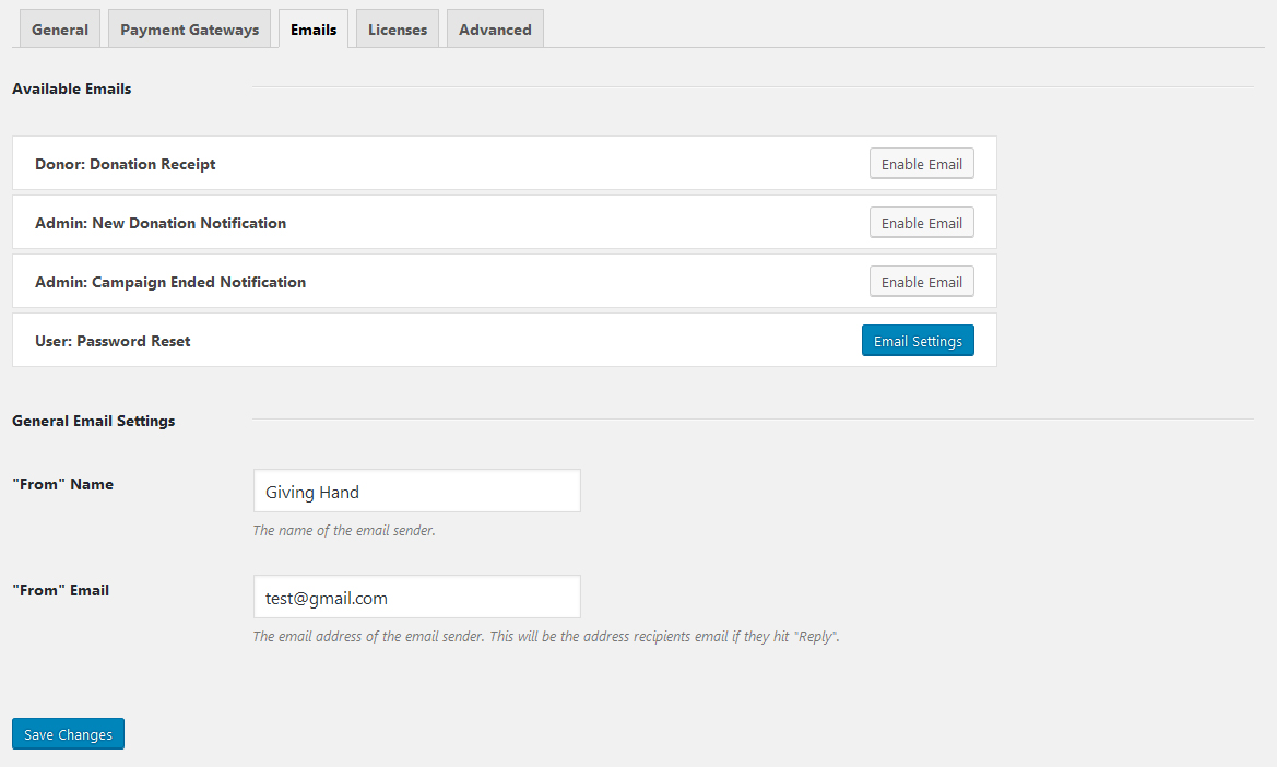 - Choose "Emails" tab to enable email notifications when new donation made, donation receipt to donators and campaign ended notifications to admin.