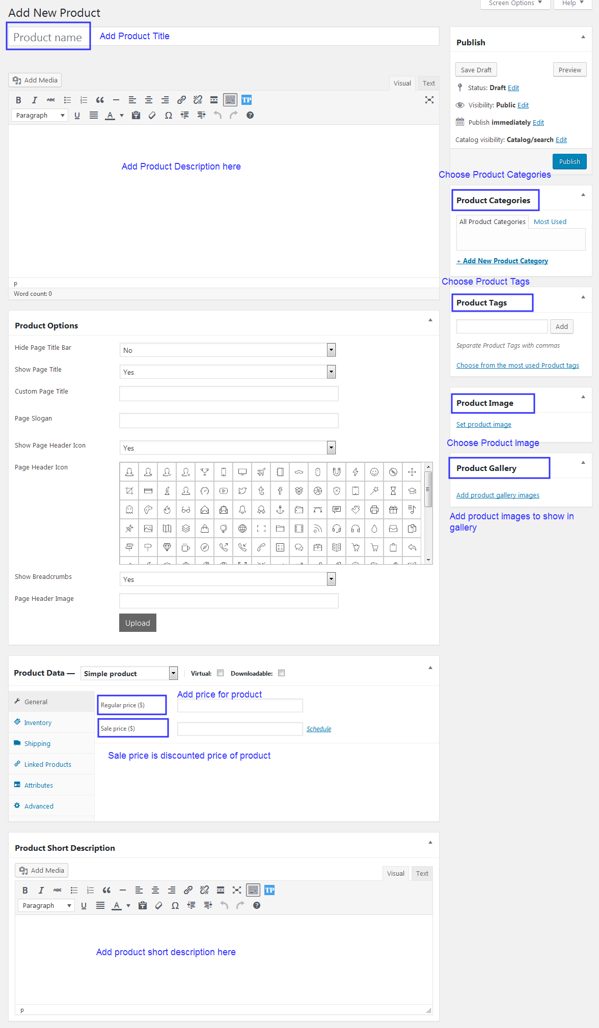 Once you’re on the Add New Product screen, you will then be able to set a title for the product item, add the description, and also provide all the data information such as price, stock status, attributes, etc.